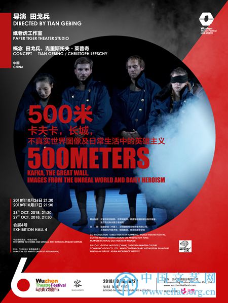 田戈兵导演于八十年代末参加实验剧场活动,1997年创立纸老虎工作室,发起和组织大量创作和艺术活动。多年来不断实践纸老虎“异托邦”式剧场美学,并于世界各地巡演。《500米:卡夫卡,长城,不真实世界图像及日常生活中的英雄主义》首演于德国汉堡塔利亚剧院,该剧撷取了很多经典文本,并且把它们不加过度得糅合在一起。抛弃了直观形象的信息传达模式,而大大拓宽了联想空间。