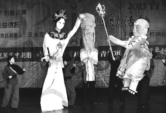 近日,台湾纸风车剧团、亦宛然掌中剧团及明华园戏剧团在台北市举行“艺术下乡”记者会,宣布这三大表演艺术团体将于3月至12月间在台湾各地共演出41场,使得台湾偏远地区的民众也能欣赏到高水平的戏剧表演。图为纸风车剧团演员在表演《巫顶的天才老妈》片段。
