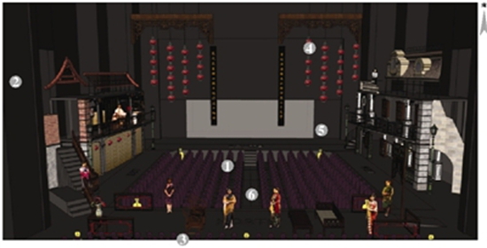 2 为便于二层的观众观剧,东西两侧的布景上会安装摄像机,在舞台台口两侧将有两块幕布,将视野遮挡的部分实时投影在幕布上,现场还有导播台负责切换。