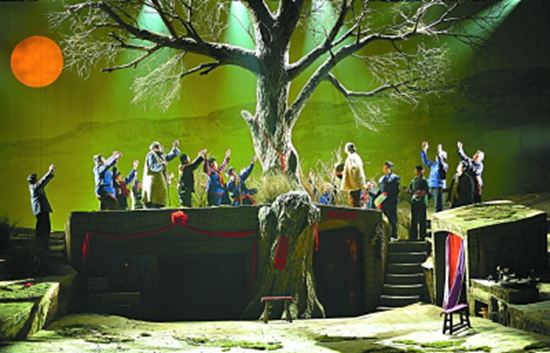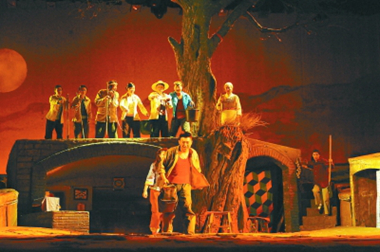三是结构精彩。舞台叙事的主线设置是戏剧人物小玉与铁蛋在命运发展中的“行动逆转”与“位置互换”。剧情是一个“梦的编织”与“梦的实现”的结构:剧情开始,小玉被诱入爱情梦境,看到的是惨愁的现实,编梦的铁蛋是主动者,撞入梦境的小玉是被动者;而后来,小玉自动改写人生约定,变3年为30年、变成铁蛋的“梦的实现者”……另外,戏剧行动线索的安排也很巧妙,舞台故事叙述十分精彩,副线设置的戏剧人物花花与石蛋,一对吵吵闹闹的冤家,为剧情、场面和细节增色不少。