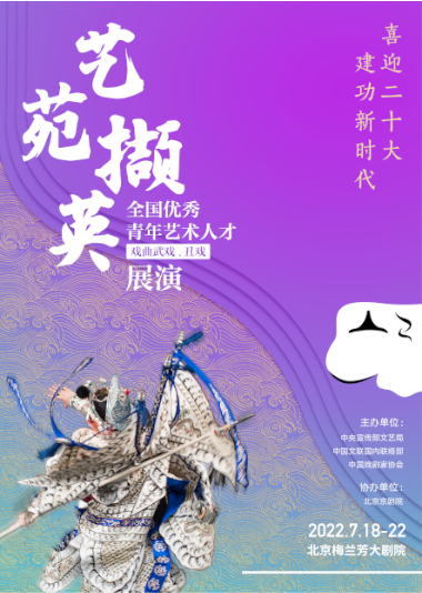7月18日,由中宣部文艺局、中国文联国内联络部、中国戏剧家协会共同主办的“喜迎二十大 建功新时代‘艺苑撷英——全国优秀青年艺术人才(戏曲武戏、丑戏)展演’”在北京梅兰芳大剧院拉开帷幕。图为演出海报。