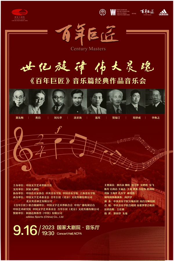 中国文联党组书记、副主席李屹,中国文联原党组书记、《百年巨匠》总顾问胡振民,原文化部部长、《百年巨匠》总顾问蔡武,中国文联党组成员、副主席、中央音乐学院院长俞峰,中国国家博物馆馆长王春法,中国文学艺术基金会理事长左中一,国家大剧院党组书记、院长王宁,中国文联书记处书记(挂职)黄豆豆,中国前驻德大使、中德友协会长史明德,一级编剧、《百年巨匠》国际版艺术总监张和平,阿迪达斯全球首席执行官比约恩·古尔登,阿迪达斯大中华区董事总经理萧家乐,《百年巨匠》出品人、总策划杨京岛等嘉宾与全场观众共同聆听纪录片《百年巨匠》音乐篇所拍摄的萧友梅、刘天华、贺绿汀、黄自、冼星海、聂耳、郑律成、李焕之8位大师巨匠的24首经典音乐作品。