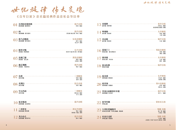 人们耳熟能详的《保卫黄河》《卖报歌》《社会主义好》,曾在烽火岁月里唤醒劳苦大众自救和抗争意识的《五四纪念爱国歌》《光明行》《太行山上》《游击队歌》,兼具浓郁地方风情和民族共同价值追求的《二月里来》《春节序曲》《八月桂花遍地开》,体现东方审美意趣和艺术价值的《玫瑰三愿》《空山鸟语》《四季歌》……诸多20世纪中国音乐经典之作,引领观众走进大师巨匠的艺术世界、精神世界,领略经典旋律的中国气派、中国风范,感受中华民族的时代强音、华彩乐章,进一步提升文化自信,厚植家国情怀。
