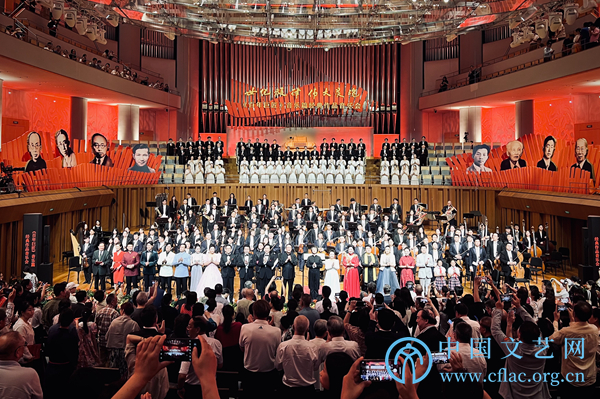 在音乐会现场,舞台两侧高悬8位音乐巨匠的画像,观众席后的彩色装饰灯光随着音乐作品的情绪不断变化,带给观众沉浸式的视听感受。《保卫黄河》《游击队歌》《延安颂》《中国人民解放军军歌》等经典作品的演绎,博得全场热烈掌声与喝彩;整场音乐会在全体观众齐唱《义勇军进行曲》中达到了高潮。