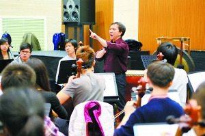 昨晚6时,记者和赵多娇一起走进中央音乐学院教学楼1201教室,这是百人大提琴乐团的第三次排练。不算很大的排练厅,挤进了一百把大提琴和10把低音提琴,就连周边的空地都摆满了半人多高的琴盒。空间局促,连指挥台都摆不下,朱亦兵被乐队紧紧包围,这刚好形成了一个非常集中的气场。“欢迎回到1201,我不知道周三的演出过去后会怎样,我只想说让我们享受片刻,活在当下”,把紧张的排练看做享受,朱亦兵的开场白与众不同。抬手间百把大提琴一同发声,浑厚丰满的乐声立刻充满整个空间,用“海啸”形容真的很恰当,巨大的声浪瞬间涌起,扑面而来,直击内心。比乐声还震撼的是朱亦兵的喊声,“眼睛!眼睛!专心看谱的学生都不是好学生”“腼腆是垃圾!不敢是饭桶!”……朱亦兵几乎在咆哮。这时候的朱亦兵已经和刚才的他完全两样,紧皱着眉,挥舞着双手,用整个身体在向乐队表达他的想法。