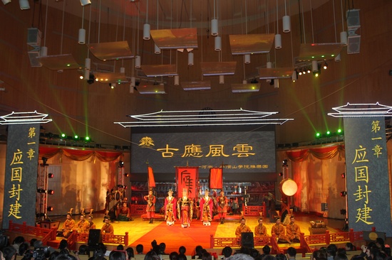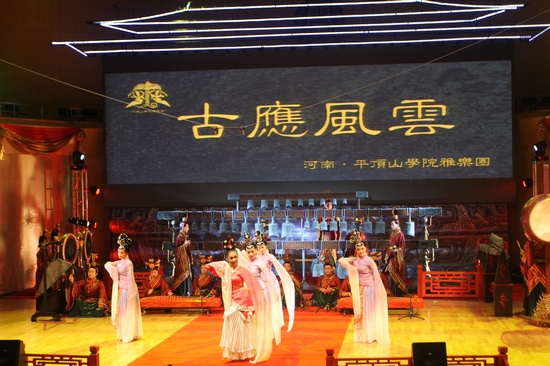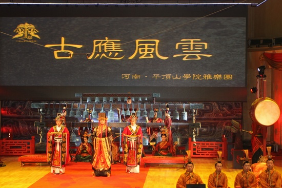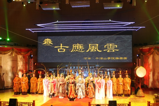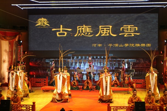 首先登场的是平顶山学院雅乐团的演员们们,他们将地处河淮、勾连南北、对传承周礼起到重要作用的西周王朝音乐呈献出来。演出采用了声、乐、舞的形式,带来了“应国封建、应汝淳风、应氏祭祖、应氏雍雍”四个主题的节目,规模宏大而声调平缓,展示了武王伐纣时期王室肃然、钟鼓齐鸣、礼乐融融的场景;在汝水河畔,征夫英勇、民妇相思的淳朴风情,体现了人民对先王赐福的感恩之心。正应了这主题“古应风云”,严肃而又静穆。节目的尾声演员们和在座的领导进行了合影留念。