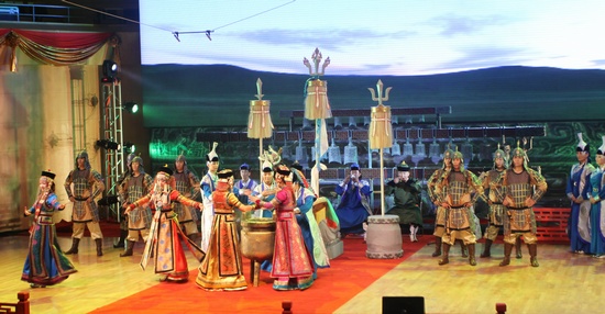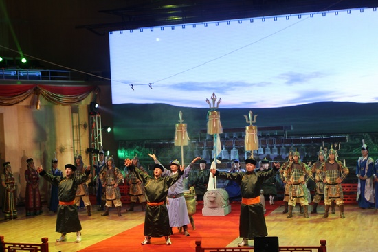 随后内蒙古的阿斯尔乐团的代表不仅主持了演出,还解说道:“阿斯尔”蒙语原意是“崇高”,后来指蒙古族宫廷音乐,在今天内蒙古的察哈尔、锡林郭勒、鄂尔多斯和蒙古国,仍能见到流落民间的宫廷曲目。今晚带来的“大帐宴歌”阿斯尔乃日,主要是宫廷乐“阿斯尔”、宫廷歌曲“潮尔”、宫廷舞蹈和祭祀仪礼等曲目。他们身着蒙古族盛装,在节目的一开始向观众展示了具有蒙古民族精神象征的苏鲁锭祭祀。其中对于哈达、香炉、圣酒等道具以及马头琴、口簧等乐器的运用更加突出了蒙古音乐的特色。演员们的热情表演营造出大元王朝“大帐宴歌”的独特魅力,体现了蒙古族欢歌乐舞的特性,展示了蒙古宫廷乐舞的昔日风貌。尤为值得一提的是男群舞《得卜色》,以其热烈、奔放的舞蹈引爆了现场气氛,在观众的热烈掌声中演员们又翻唱了曲目。笔者对团长伊拉图的采访中了解到,他们非常荣幸参与这样齐聚宫廷乐的盛会,无疑是对他们的鼓舞和肯定。