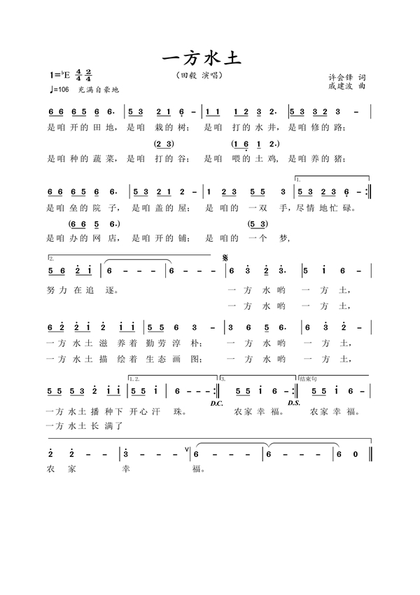 由许会锋作词、戚建波作曲的新农村题材歌曲《一方水土》,讲述了勤劳淳朴的小村人在建设美丽乡村征途上,一起追梦、一路打拼的奋斗故事。通过开田、栽树、打井、修路、种菜、打谷、喂鸡、养猪、盖房、开店等一个个感人的场景,讴歌了新时代农民迎着“乡村振兴”的春风,用辛勤汗水创造出一方美丽水土的崭新风貌。
