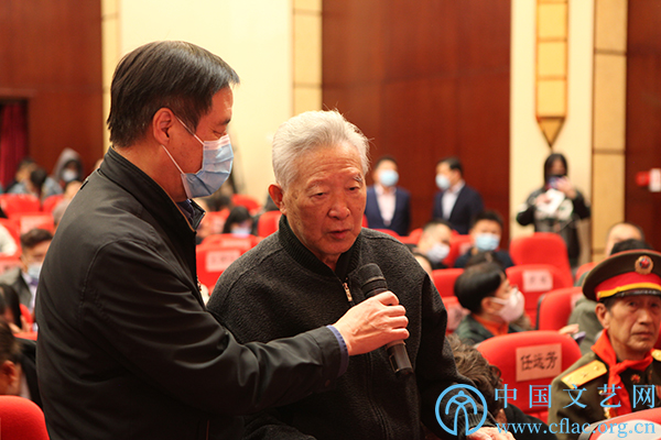 10月16日,红色经典音乐剧《闪闪的红星》亮相北京梅兰芳大剧院。图为中国音乐家协会名誉主席、著名作曲家、电影《闪闪的红星》曲作者傅庚辰先生接受采访。主办方供图
