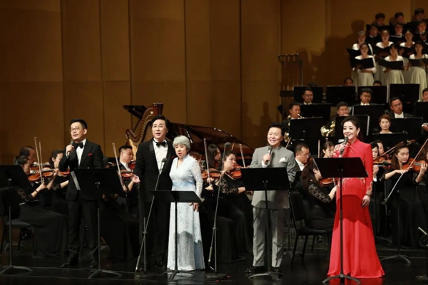 歌唱家王庆爽、石倚洁、王宏伟、廖昌永、迪里拜尔在演出中