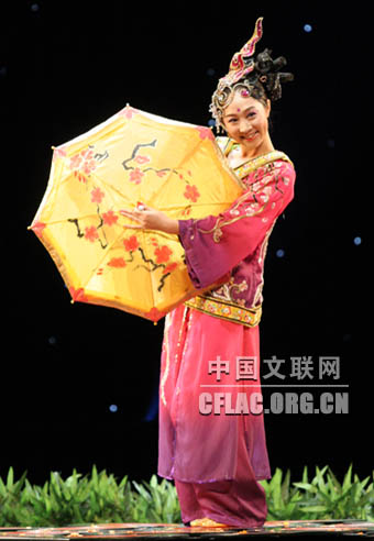 7月21日,中国金奖魔术节目展演暨2009年北京世界魔术大会开幕式晚会预演在京举行。图为曲蕾表演《梅桩伞舞》。中国文联网 余宁摄影报道