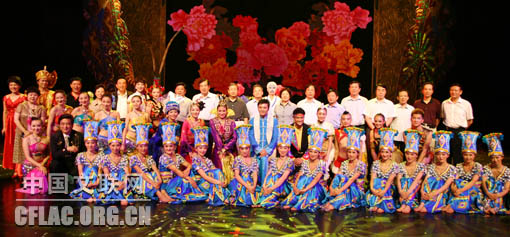 7月21日,中国金奖魔术节目展演暨2009年北京世界魔术大会开幕式晚会预演在京举行。图为晚会结束后,有关领导与演职人员合影。中国文联网 余宁摄影报道