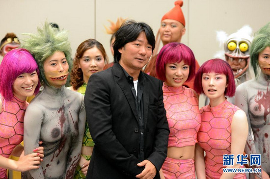 6月24日,杂技音乐剧《西游记》的导演陈士争(中)和部分演员在美国纽约与媒体及观众见面。