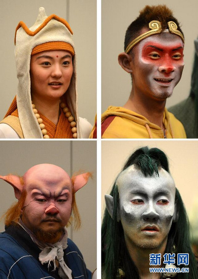 这是杂技音乐剧《西游记》中的主要演员(左起,从上至下)唐僧、孙悟空、猪八戒和沙和尚在剧中的造型(6月24日摄)。