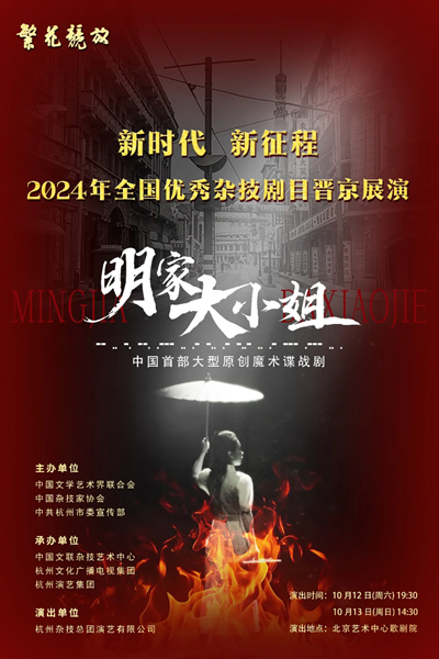 金秋十月桂花香,凤舞长天喜庆翔。在举国同庆中华人民共和国成立75周年之际,由中国文学艺术界联合会、中国杂技家协会、中共杭州市委宣传部主办,中国文联杂技艺术中心、杭州文化广播电视集团、杭州演艺集团承办的“新时代 新征程——2024年全国优秀杂技剧目晋京展演暨大型原创魔术谍战剧《明家大小姐》晋京展演”于10月12日至13日在北京艺术中心歌剧院举行。这也是“繁花竞放”——2024年中国文联文艺优秀作品展演展示活动之一。作为突破传统跨界融合的“破圈”之作,由杭州杂技总团演艺有限公司创演的《明家大小姐》,首次向北京观众展现了魔术剧的魅力。