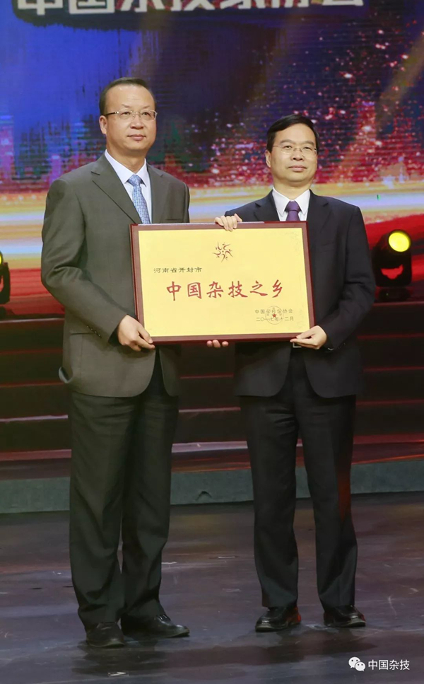 随后,刘挥宣读了中国杂协授予开封市“中国杂技之乡”的决定,王仁刚向开封市人民政府市长高建军颁发‘’中国杂技之乡‘’牌匾。