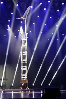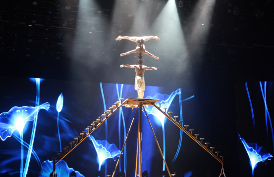 图为济南市杂技团表演的《云端鼓舞——高椅》