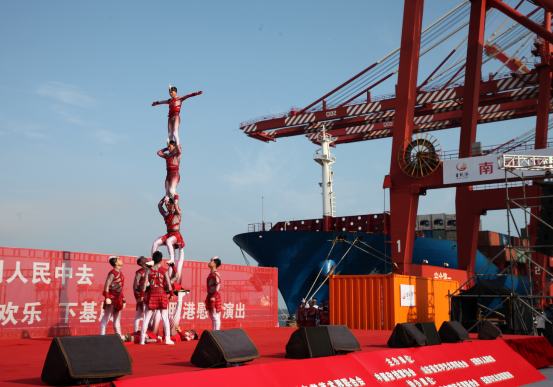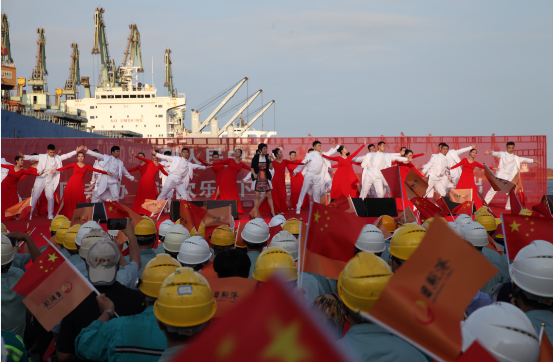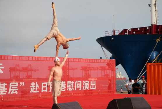 7月27日下午,“到人民中去”——中国文联、中国杂协“送欢乐 下基层”赴日照港集团公司慰问演出。在吞吐量位居全国沿海港口第七位的日照港码头上,数千名工人共同观看了济南市杂技团的《勇者无惧——蹬人》《行者——杆上技巧》、遂宁市杂技团的《男子双人技巧》等精彩纷呈的杂技节目,由于是在户外港口演出,杂技演员们克服酷暑热浪及现场条件的影响,精心完成一个个惊险的高难度技巧动作,现场不断爆发出热烈的掌声和叫好声;魔术师王立民和丁德龙一展魔术的神奇魅力,令人大呼过瘾;歌唱家林萍、高保利和歌手石头献上激情澎湃的歌曲,演出现场欢快热烈。最后,歌舞《红旗飘飘》将气氛推向高潮。