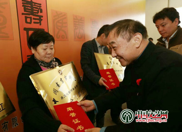 图为与会领导向“寿文化艺术委员会战略合作单位”进行授牌