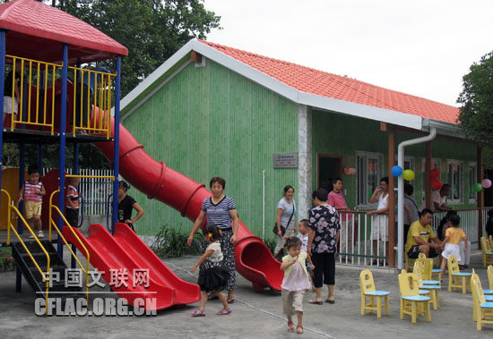 日上午,在重灾区都江堰幸福家园灾民安置区的一角,一圈由红瓦绿墙围成的幼儿园内,彩旗飘飘,歌声飞扬。家长领着兴高采烈的孩子们正在参观他们的新家——都江堰泰欣.爱心亲子园,汶川大地震后两个多月,曾经一起生活过的孩子们终于又可聚在一起,重续往日的欢乐。
