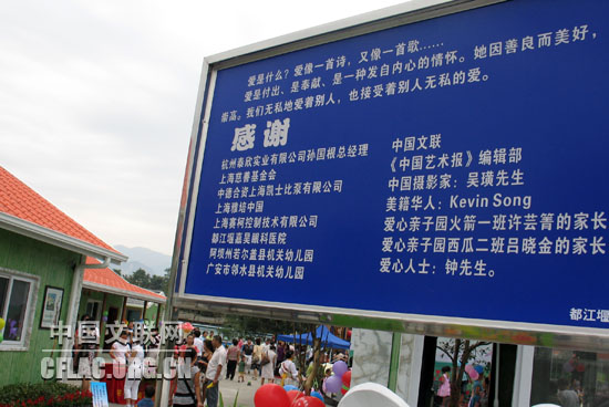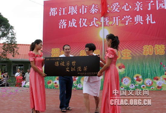 爱心亲子园落成仪式暨开学典礼在当天上午举行,来自全国各地参与亲子园捐建、捐助的单位和个人代表以及学生、家长一千余人参加了开园典礼。大力推动该园建设的著名作家黄亚洲和中国艺术报社驻四川记者站记者应邀出席。在仪式上,济南军区某部为亲子园举行了庄严的升国旗仪式。黄亚洲说,5.12大地震后第九天他来到都江堰,见到在地震中被毁的幼儿园的施园长,被她对幼教事业的无比热爱和重建学校的坚强信念所感动,回到北京后写了文章和诗歌在《中国艺术报》上发表,没想到全国各地的许多单位和朋友看到文章后纷纷伸出爱的援手,在不到两个月的时间内就建好这座充满温馨的幼儿园,他很欣慰,祝愿爱心亲子园越办越好。园长施志勤说,目前,这个幼儿园是全灾区的样板幼儿园,她有信心把它建成灾区最漂亮的幼儿园,让所有到这个幼儿园来的小朋友受到最好的幼儿教育。她还希望所有灾区的幼儿得到最好的上学环境,感谢所有帮助爱心亲子园的朋友们。施园长向所有捐赠单位赠送了牌扁以示感谢,曾通过多种方式向该园伸出援助之手的中国艺术报社委托驻四川记者站记者邓风接受了牌匾。