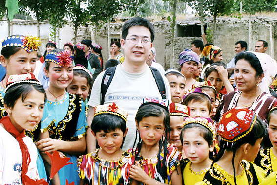 2007年10月,赴新疆采访时和少数民族儿童在一起