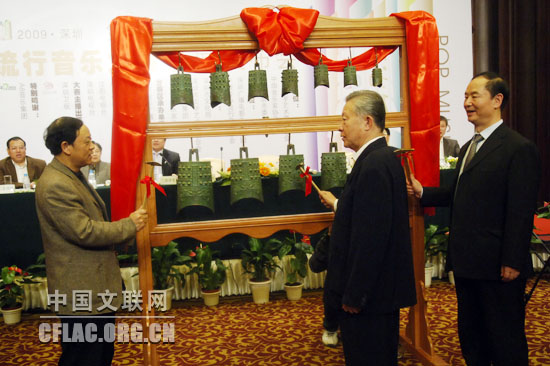 3月18日,第七届中国音乐金钟奖流行音乐大赛新闻发布会在京举行。图为中国音协主席傅庚辰(中)、中国文联国内联络部主任夏潮(左)、深圳市委宣传部副部长段亚兵(右)在启动仪式现场。