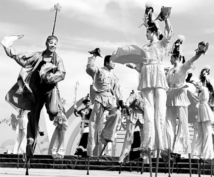 拍摄广场上的民俗舞蹈活动,首先要选择好拍摄的位置,一般以居高为好,可以俯拍到整个舞蹈的气势、场面。如没有居高点,也要站在表演者前面的位置,才能避开观众人群的干扰,避开其他摄影者的干扰,画面才能干净,才能够较清晰地拍摄到表演者,较真实地记录并表现出民俗舞蹈活动的全貌。《高跷秧歌》这幅作品就是采用常规的拍摄法,站居较前面的好位置,基本准确地反映出了民俗舞蹈热闹、欢快、喜庆的氛围。