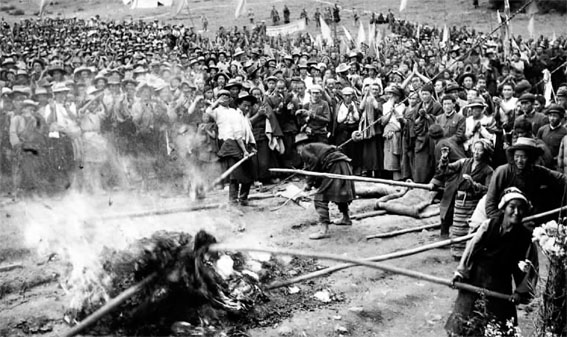 封闭落后、生产凋敝、民不聊生的情景,让劳苦农奴和陈宗烈这样从内地到西藏的人都感到旧制度是“非改不可”。1959年3月10日,以达赖为首的反动集团发动叛乱,几天后,解放军平息叛乱,西藏的民主改革也拉开了帷幕。“民主改革是一个彻底解放人权、推翻三大领主统治的过程,西藏原有的武装力量被废除,藏币停止使用,而带给老百姓的最大改变,就是分到了牛羊与田地,自己成了自己的主人。”民主改革的逐步推行,让陈宗烈有更多的机会下到农村、牧区,感受西藏翻天覆地的变化,这些都体现在他的作品中。在作品《分牲畜》中,从没喝过牛奶的农奴第一次分到了牛;在作品《扬眉吐气》中,达孜县的农奴们烧掉了束缚他们人身自由的债券、契约,从烈火中感受到扬眉吐气的畅快;1959年,推行“谁种谁收”的政策,农奴们有了自己的劳动成果,这与以前沿用千年的二牛抬杠技术亩产100斤的生产力已经不可同日而语;在《学藏文拼音》中,拼音课上孩子们琅琅的读书声,仿佛也能从图片中透溢出来……“其实摄影很多时候都是偶得,当时也没有想到,摄影可以揭发农奴制的罪恶,记录民主改革的成就,但今天看来,摄影的图像,就有这样的力量。”陈宗烈说。