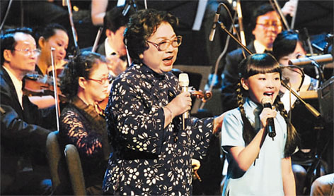 在王昆从事革命文艺工作70周年师生演唱会上,王昆(左)与她年仅9岁的学生豆豆一起演唱《南泥湾》。李治平取摄