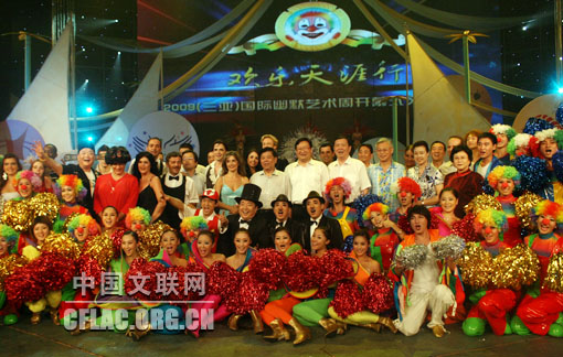 8月12日晚,2009(三亚)国际幽默艺术周在鹿城三亚开幕。图为在开幕式晚会现场,有关领导和嘉宾与晚会演职人员合影。中国文联网 邱振刚 摄