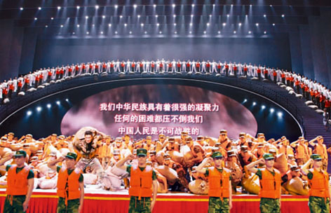 作为一部以中华民族169年探索、奋斗、发展史为线索的全景式史诗性艺术作品,《复兴之路》在两个半小时的演出中艺术而集中地展示了观众熟知的重大历史事件,鸦片战争、辛亥革命、中国共产党成立、抗日战争、解放战争、新中国成立、改革开放,及至近年来的香港澳门回归、海峡两岸直航、九八抗洪、“神五”上天等都以凝练而生动的艺术形式呈现在观众面前。以第一章《山河祭》为例。记者在现场看到,1840年圆明园的一场昆曲演出拉开了本章的序幕,华丽的场景、悠扬的曲声中,一群身着戏服的昆曲演员身段婀娜地表演着《惊梦》,清朝宫廷的太监、宫女不断穿场而过。忽然,一声炮响,舞台上的大屏幕中,一面巨大的镜子霎时破裂,演员、宫女、太监乱作一团、四散奔走。音乐即转为咚咚的急促与紧张,大屏幕上,西方列强的炮火硝烟不断闪现,《南京条约》等一系列不平等条约的字幕也铺满了整个舞台。一段悲怆的诵赋《山河祭》响起,“盘古开天,三皇拓土……列强入室、赤县刀俎……”,催人泪下。在稚气的《辛亥童谣》声中,一群舞蹈演员以当时剪辫子的行动,形象地表现了革命的悲壮,经过不断挣扎与努力,最终演员们仰天高呼出了“天下为公”。《曙色》的歌声响起了,600多位演员密密麻麻一个紧挨着一个,组成了一道立体人墙,他们呐喊、抗争,象征着国人不屈的精神,也寓意只有团结起来才能获得自由。从1840年到1921年,80多年的历史,就是通过《惊梦》《山河祭》《辛亥童谣》《曙色》这4个节目生动地表现了出来,气势磅礴,感人至深。