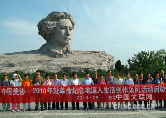 8月21日,在湖南长沙橘子洲巨大的青年毛主席雕塑前,中国文联、中国美协2010年赴湖南革命纪念地深入生活、创作采风活动启动。图为启动仪式现场。中国文联网 段泽林 摄