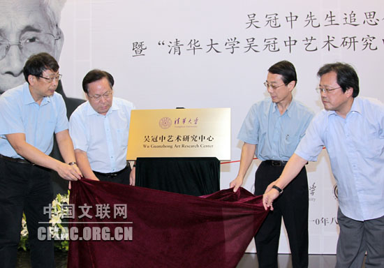 8月29日是美术家吴冠中91岁诞辰纪念,在这一天,由中国文联、清华大学共同主办的“向人民艺术家致敬——吴冠中先生追思会暨清华大学吴冠中艺术研究中心成立仪式”在清华大学举行。图为主办方领导与吴冠中之子吴可雨为吴冠中艺术研究中心揭牌。中国文联网 崔凯 摄