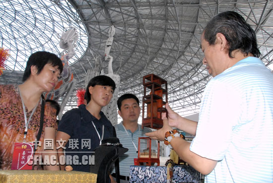 8月27日至28日,由江苏昆山花桥经济开发区管委会、中央电视台七频道《乡村大世界》栏目联合主办的2010年海峡两岸文化创意产业发展高峰论坛在江苏昆山隆重举办。期间,在东南东文化创意产业园内举办的2010海峡两岸特色产品博览会吸引了全国各地的观众。图为参展艺术家向观众展示自己的作品。中国文联网 孟祥宁 摄