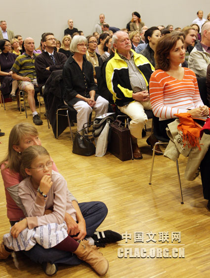 当地时间8月31晚,“今日中国”主题演出活动在柏林中国文化中心礼堂举办。图为演出现场爆满,没有座位的德国观众或站在后排,或席地而坐。中国文联网 康伟 摄