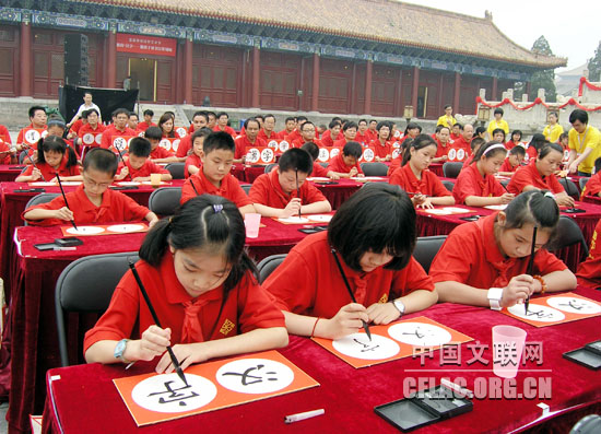 由中华文化联谊会、中国艺术研究院、河南省安阳市政府及台湾“文化总会”联合主办,中国艺术研究推广中心、台湾中华新文化发展协会共同承办,首届“两岸汉字艺术节”9月16日在北京太庙拉开大幕。图为青少年书法爱好者共同书写“汉字”。中国文联网 冉茂金 摄