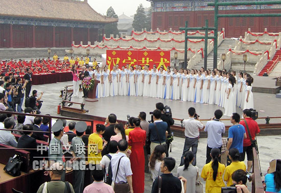 由中华文化联谊会、中国艺术研究院、河南省安阳市政府及台湾“文化总会”联合主办,中国艺术研究推广中心、台湾中华新文化发展协会共同承办,首届“两岸汉字艺术节”9月16日在北京太庙拉开大幕。图为著名指挥家刘森带领中国音乐学院附中的“青春女子合唱团”吟唱《诗经》,为“两岸汉字艺术节”拉开序幕。中国文联网 冉茂金 摄