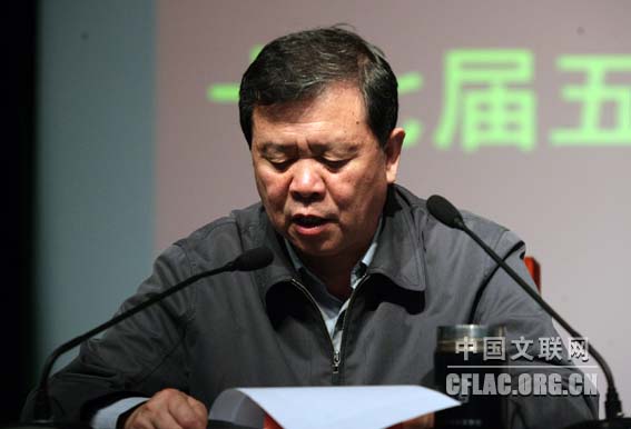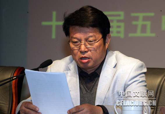 10月20日,中国文联传达贯彻党的十七届五中全会精神大会在中国文艺家之家召开。中国文联党组书记、副主席胡振民,党组副书记、副主席覃志刚、李牧,党组成员、副主席冯远、廖奔,党组成员、书记处书记夏潮出席大会。图为覃志刚传达党的十七届五中全会精神。中国文联网 孟祥宁 摄
