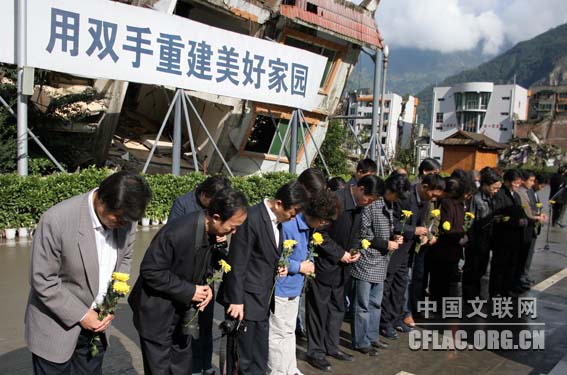 10月29日,考察团在北川地震遗址悼念5·12特大地震遇难同胞。中国文联网 张志勇 摄