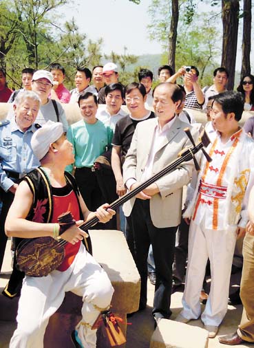 赵季平在延安采风时与民间艺人亲切交谈。宁静 摄