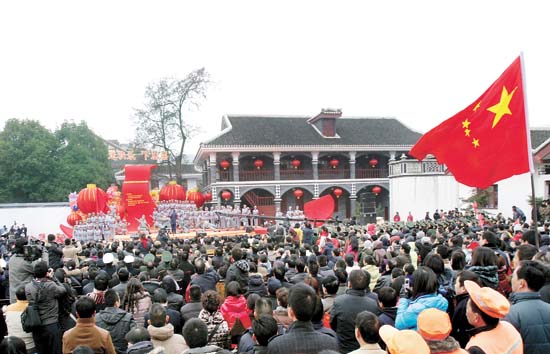 1月8日上午10点,慰问演出在遵义会议会址广场如约拉开帷幕。胡振民、王富玉、谌贻琴、谢庆生、夏潮和吴长江、董耀鹏、冯双白、罗杨、李前光、赵长青、邵学敏、罗成琰等中国文联所属部分全国文艺家协会、机关有关部室负责人,李裴、李建国、李碧川等贵州省有关单位负责人,慕德贵、王晓光等遵义市领导和现场群众一起观看了演出。