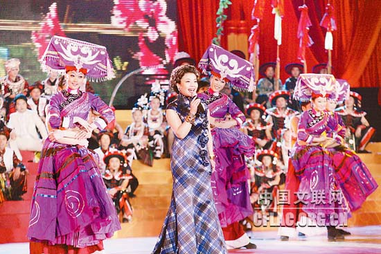 1月16日下午,北京人民大会堂大宴会厅张灯结彩,喜气洋洋,由中国文联主办的“百花迎春——中国文学艺术界2011春节大联欢”在这里隆重举行。图为黔东南青年演唱侗歌《迎春花开红军来》。中国文联网 孟祥宁 彭宽 李亮 摄