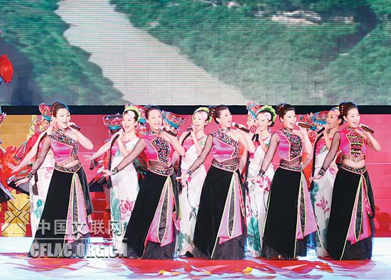 1月16日下午,北京人民大会堂大宴会厅张灯结彩,喜气洋洋,由中国文联主办的“百花迎春——中国文学艺术界2011春节大联欢”在这里隆重举行。图为载歌载舞的湖北民歌《龙船调》。中国文联网 孟祥宁 彭宽 李亮 摄