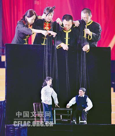 1月16日下午,北京人民大会堂大宴会厅张灯结彩,喜气洋洋,由中国文联主办的“百花迎春——中国文学艺术界2011春节大联欢”在这里隆重举行。图为别出心裁的提线木偶剧《潜伏》。中国文联网 孟祥宁 彭宽 李亮 摄