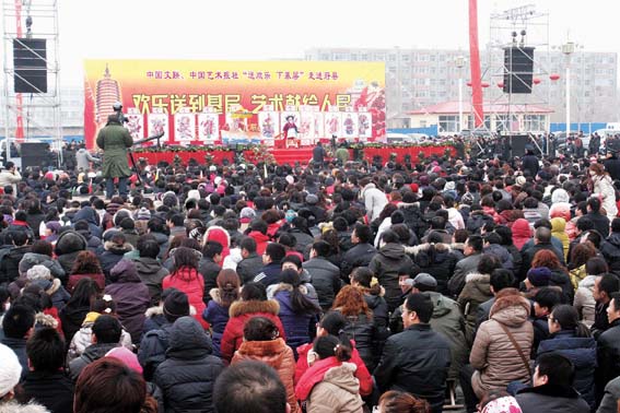 在零下好几度的室外,艺术家们穿着单薄的演出服为观众演出。这种敬业精神深深感动了现场的观众,他们向艺术家们报以最热烈的掌声和欢呼声。而观众们的热情也感染了艺术家,他们纷纷为观众加演节目。已经66岁的歌唱家耿莲凤更是加唱了两首歌曲。艺术家纷纷表示:只要观众喜欢,我们就多演;观众不冷,我们也不冷。整场演出,文艺家和演员都拿出了自己的“拿手绝活”,曲艺、戏剧、杂技、音乐、舞蹈等节目,个个精彩,好戏连台,让蔚县的观众着实过了一把瘾。整场演出,台上台下互动,或演员下台,在观众中表演;或观众名家合演;或全场齐歌共舞。现场气氛和谐融洽。一位名叫黄长华的大姐带着5岁的儿子专程来看演出,她激动地表示,自己是第一次在家门口看这样的大型文艺演出,感谢中国文联、中国艺术报社组织这么多艺术家来为他们演出这么精彩的节目。演出过程中,书画家们还登台向蔚县人民赠送了书画作品。蔚县秧歌剧团等地方艺术团体也献上具有地方风味的表演,和文艺家们一起尽情挥洒艺术之美。张家口市电视台对本场演出进行了现场直播,数百万观众收看了实况。许多观众表示,这场演出比看央视春晚还过瘾。