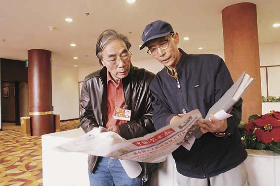 宋雨桂、韩书力委员阅读《中国艺术报》两会报道 中国文联网 彭宽/摄