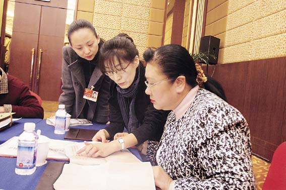 邰丽华委员(左一)在助手的协助下请苏国璋委员(右一)联名提案。中国文联网 彭 宽/摄