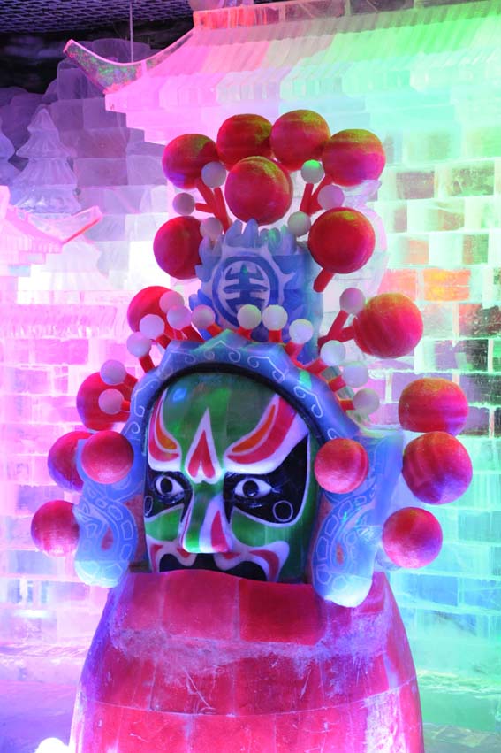 3月14日,哈尔滨太阳岛冰雪艺术馆内的京剧脸谱冰雪景观十分醒目,夺人眼球。当日,哈尔滨市太阳岛冰雪艺术馆内的冰雕艺术品再次亮相。据了解,今年冰雪艺术馆以“忆·中国风”为主题,由玉兔迎春、欧情冰酒吧、冰上乐园、国韵、五亭桥等景区组成。馆内所有冰雕作品采用了LED二级发光管,全部内置镶嵌在冰雕内,既节约能源,又提升了冰雕的观赏效果,为游客呈现出多彩的冰雪童话世界。