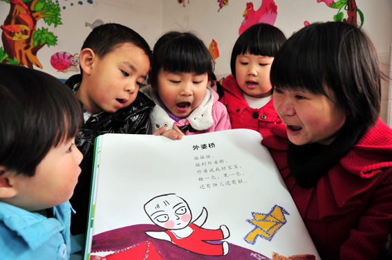 3月21日,湖北省宜昌市夷陵区机关幼儿园开展以“传唱童谣、快乐成长”为主题的儿歌练唱活动,孩子们用儿歌迎接3月21日“世界儿歌日”。图为湖北省宜昌市夷陵区机关幼儿园的老师在教小朋友唱儿歌。